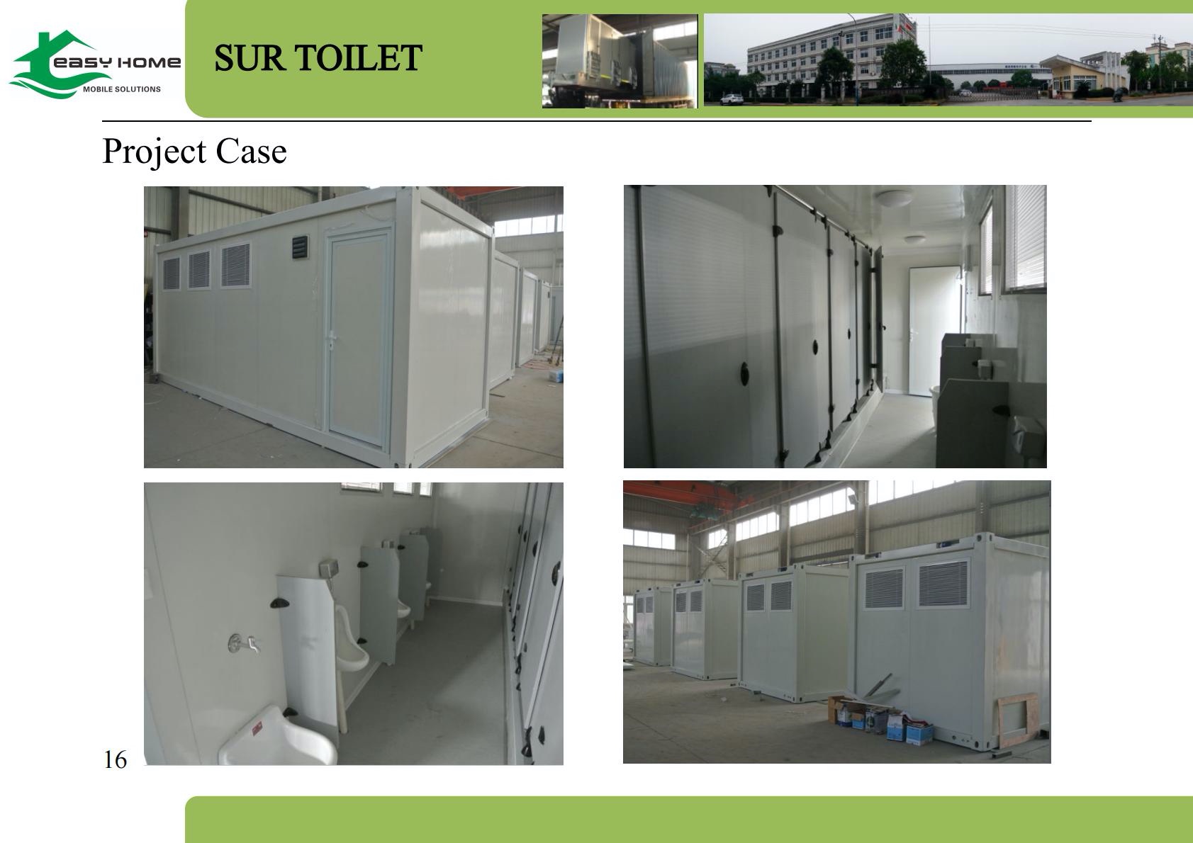 A container toilet is a modular sanitary building constructed using a steel frame structure and prefabricated wall panels. The unit is manufactured in a factory and delivered to the site as a complete restroom facility.